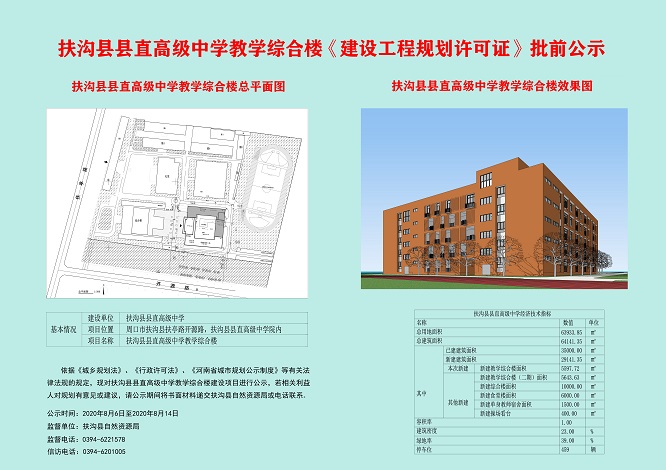 依据《城乡规划法》、《行政许可法》、《河南省城市规划公示制度》等有关法律法规的规定,现对扶沟县县直高中教学综合楼建设项目进行公示,若相关利益人对规划有意见或建议,请公示期间将书面材料递交扶沟县自然资源局或电话联系。