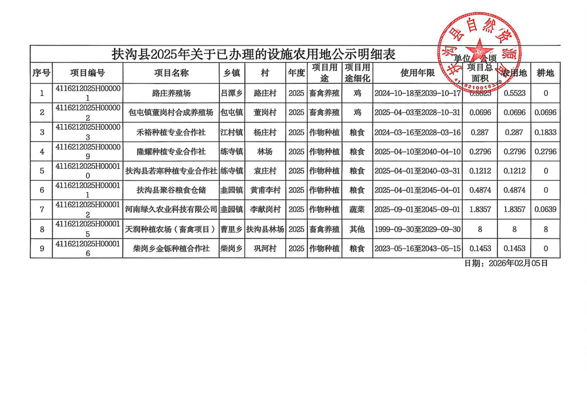 扶沟县2025年关于已办理的设施农用地公示明细表