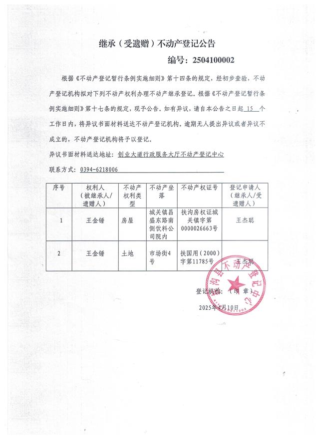 继承(受遗赠)不动产登记公告、编号:2504100002
