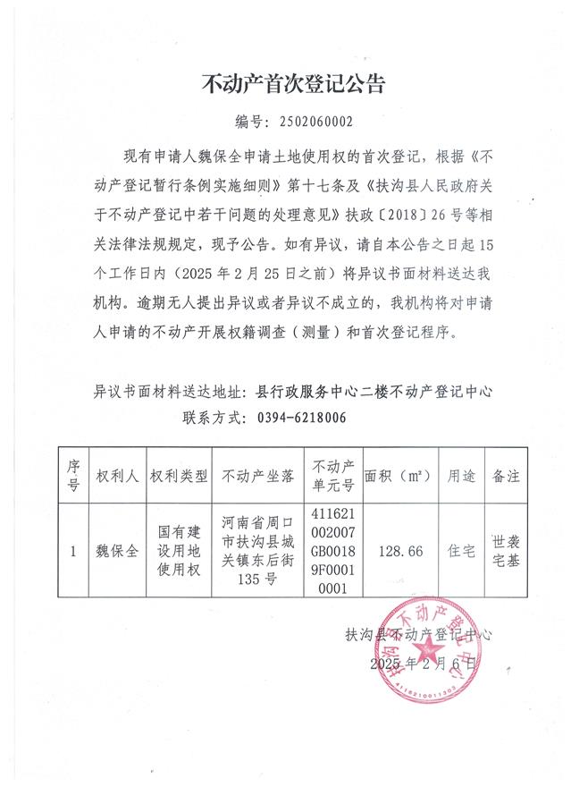 不动产首次登记公告、编号:2502060002
