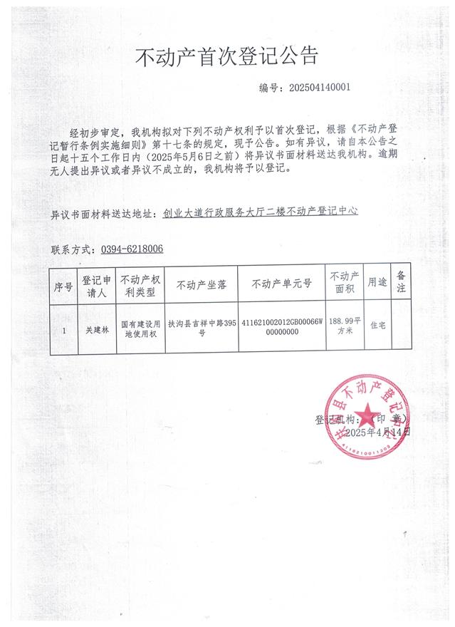 不动产首次登记公告、编号:202504140001