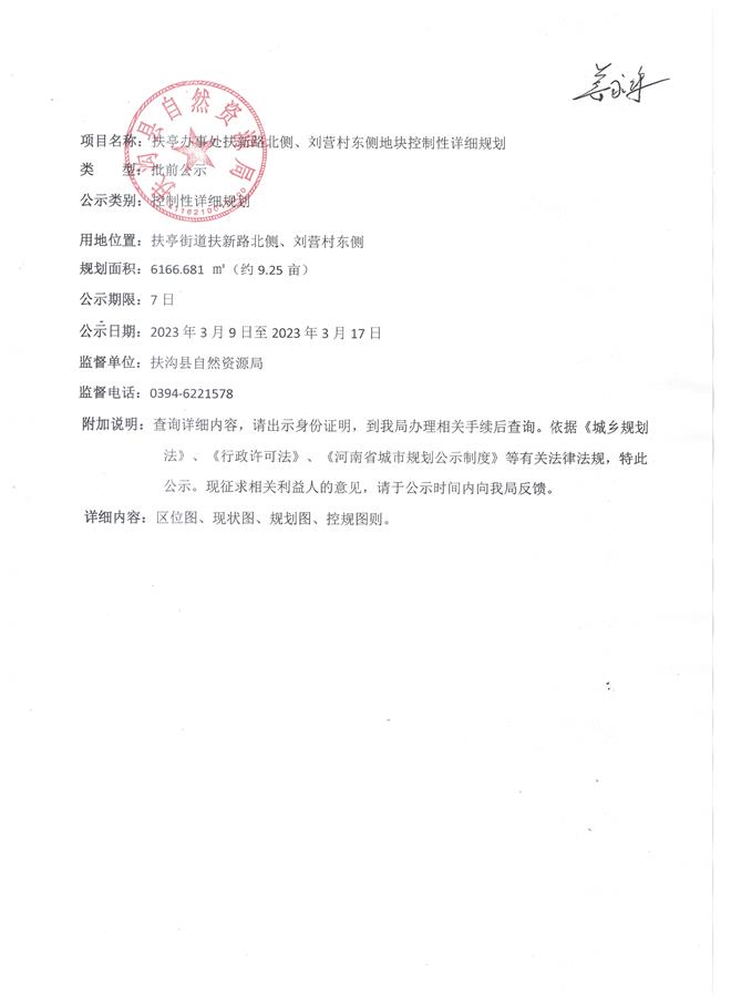 扶亭办事处扶新路北侧、刘营村东侧地块控制性详细规划