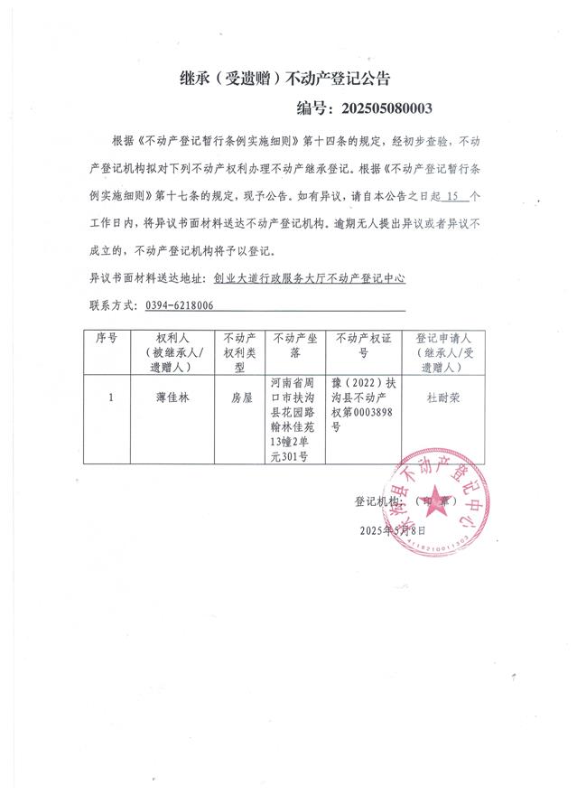 继承(受遗赠)不动产登记公告、编号:202505080003
