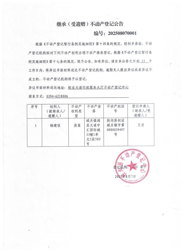 继承(受遗赠)不动产登记公告、编号:202508070001