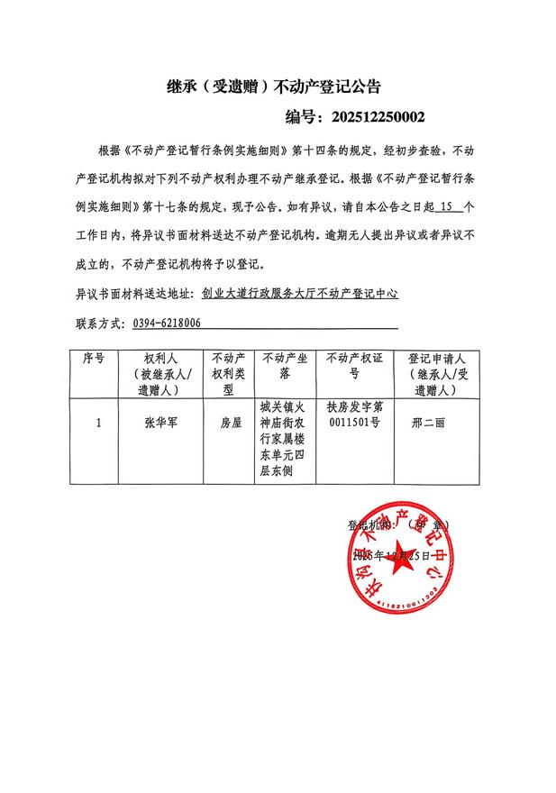 继承(受遗赠)不动产登记公告、编号:202512250002