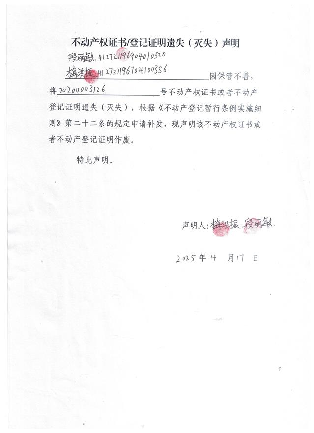 不动产去权证书/登记证明遗失(灭失)声明