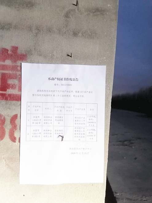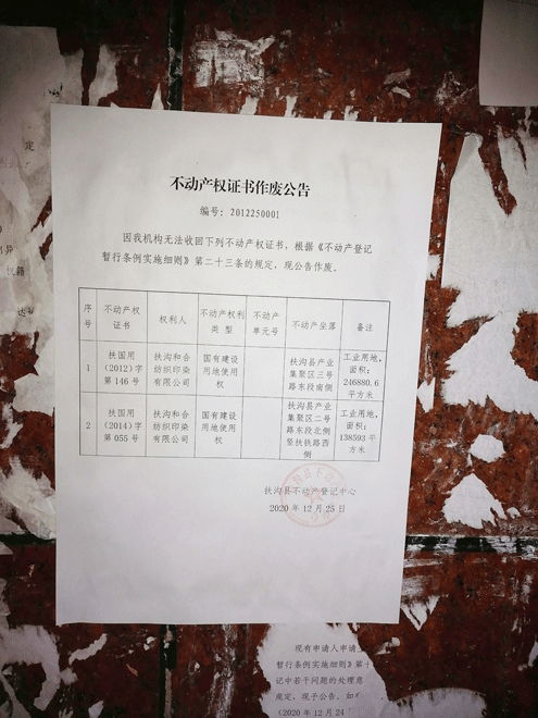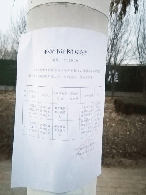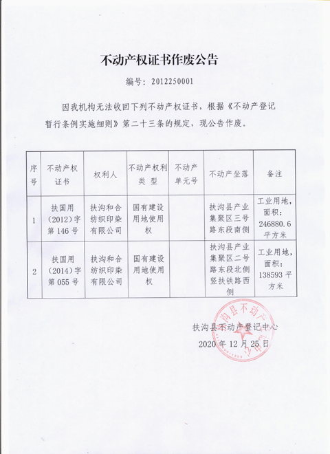 不动产权证书作废公告(扶沟和合纺织印染有限公司)