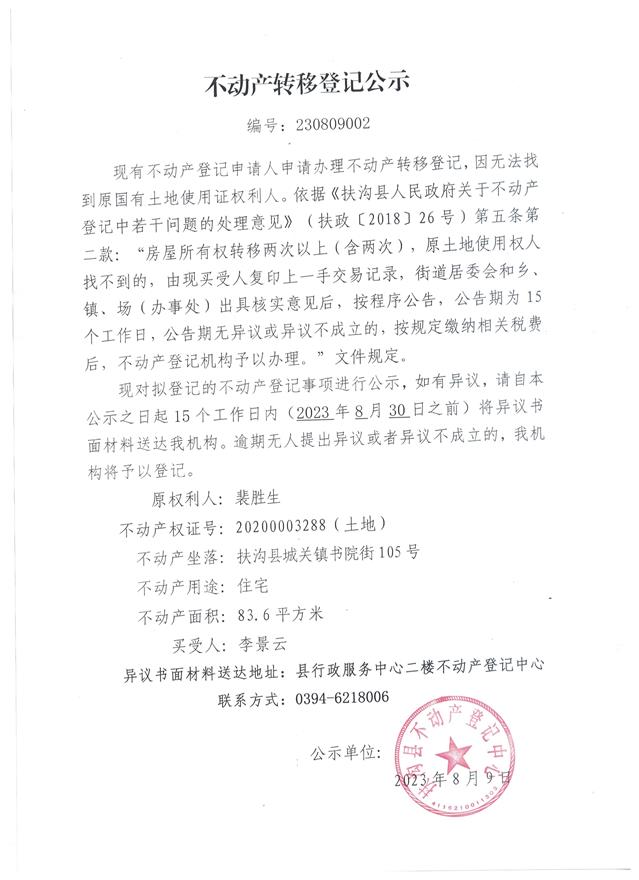 不动产转移登记公示、编号:230809002