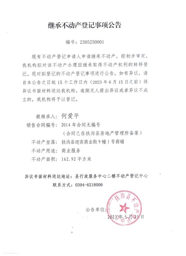 继承不动产登记事项公告、编号:2305250001