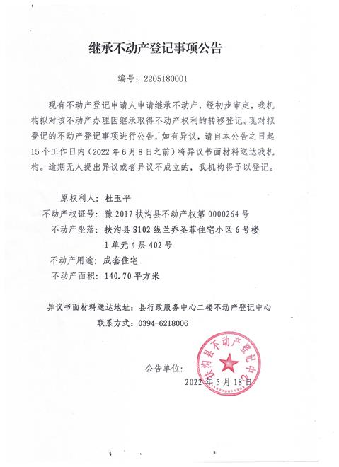 继承不动产登记事项公告、编号:2205180001