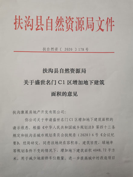 扶沟县自然资源局关于盛世名门C1区增加地下建筑面积的意见