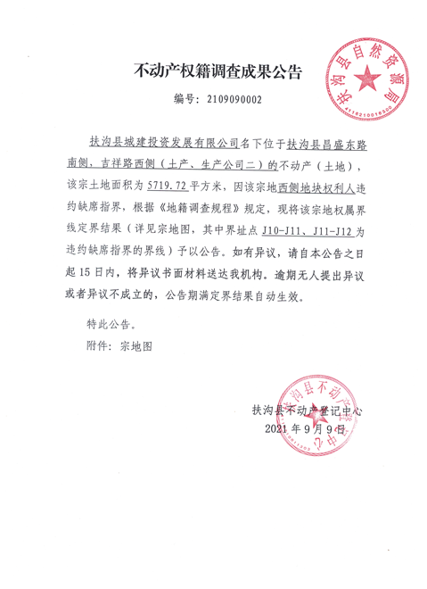 不动产权籍成果调查公告、编号:2109090002