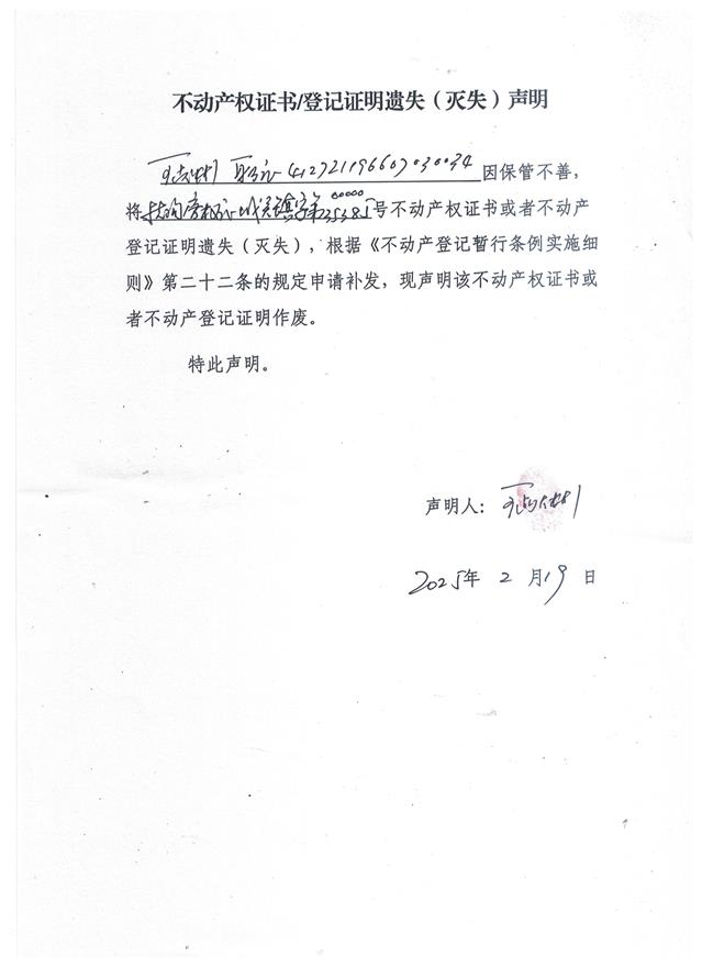 不动产权证书/登记证明遗失(灭失)声明