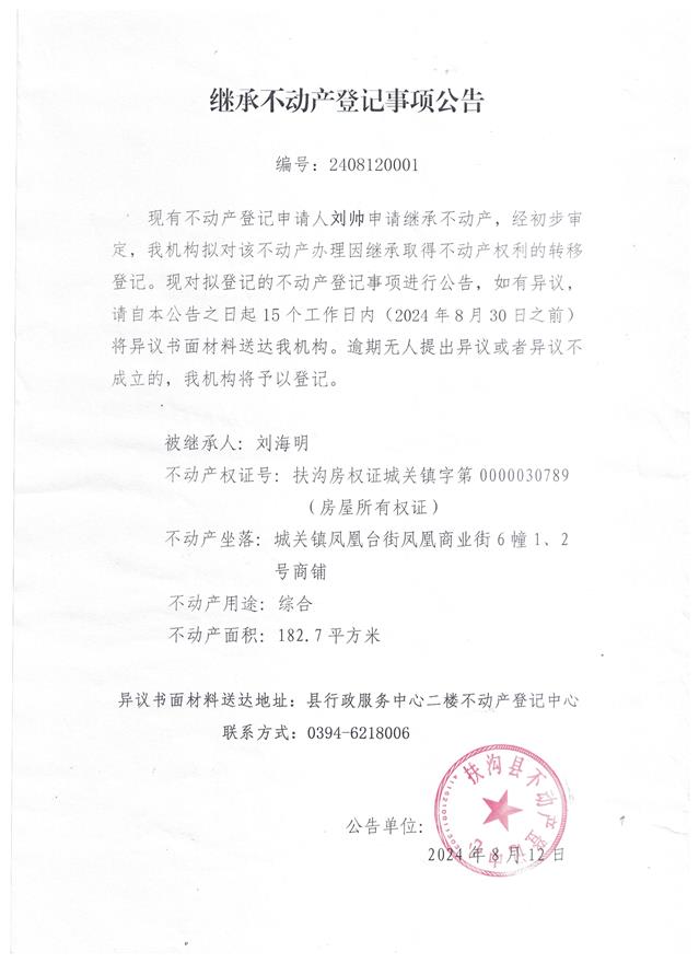 继承不动产登记事项公告、编号:2408120001