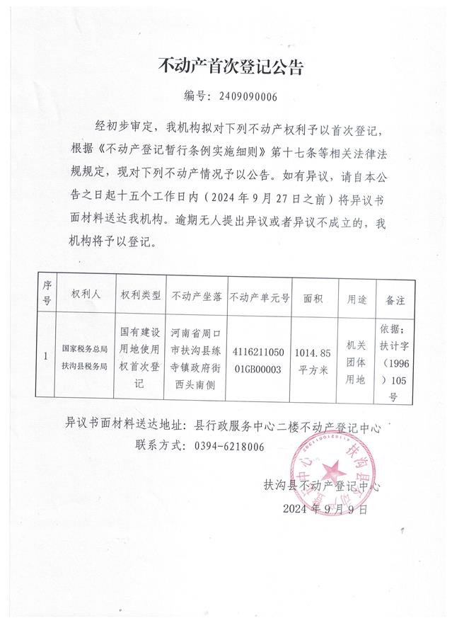 不动产首次登记公告、编号:2409090006
