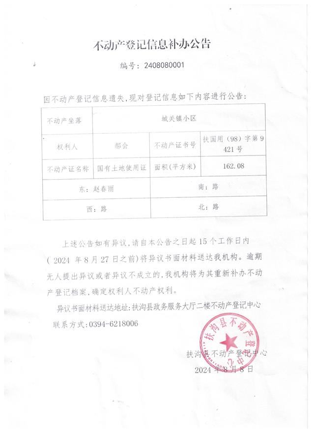不动产登记信息补办公告、编号:2408080001