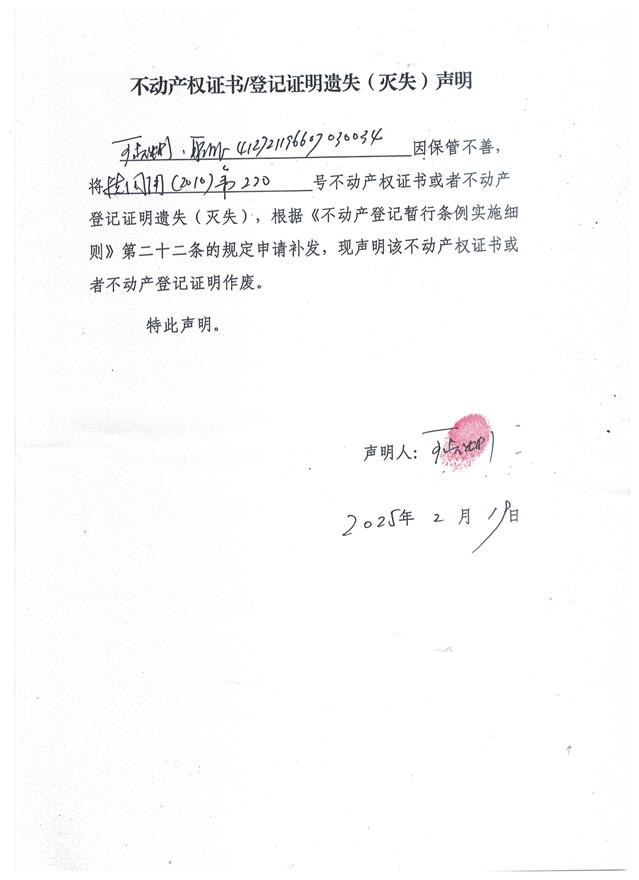 不动产权证书登记证明遗失(灭失)声明