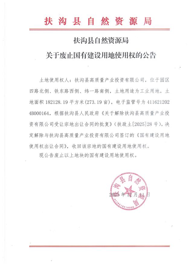 扶沟县自然资源局关于废止国有建设用地使用权的公告