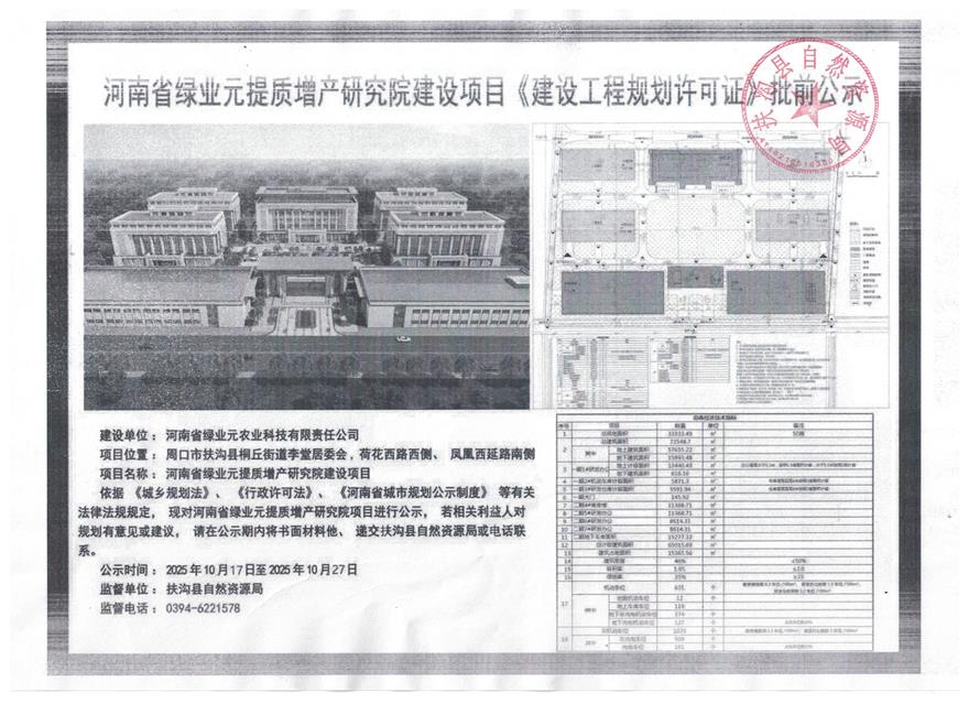 河南省绿业元提质增产研究院建设项目《建设工程规划许可证》批前公示》