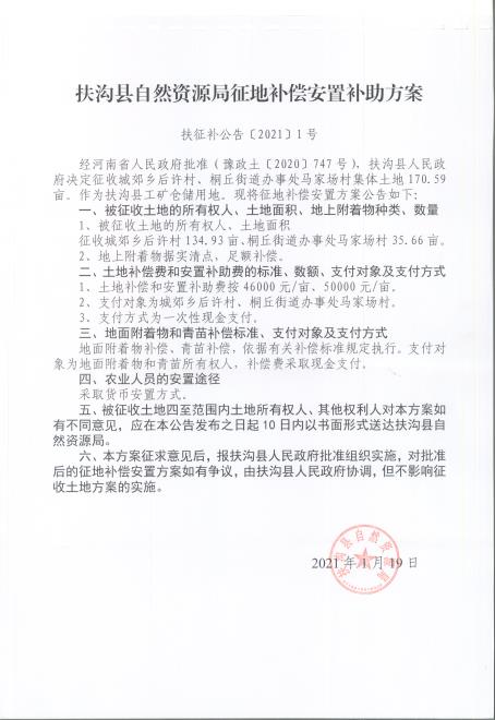 扶沟县自然资源局征地补偿安置补助方案、扶征补公告[2021]1号