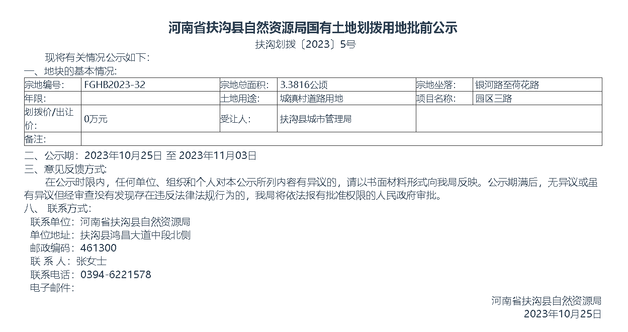 河南省扶沟县自然资源局国有土地划拨用地批前公示扶沟划拨〔2023〕5号