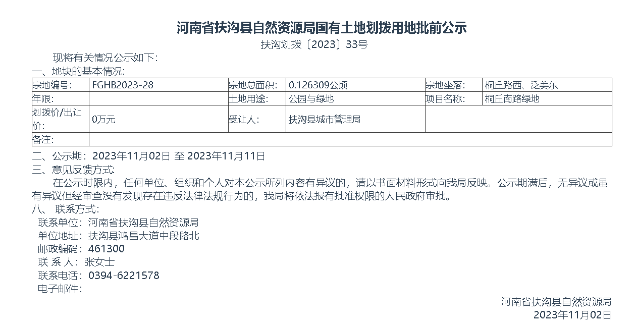 河南省扶沟县自然资源局国有土地划拨用地批前公示 扶沟划拨〔2023〕33号